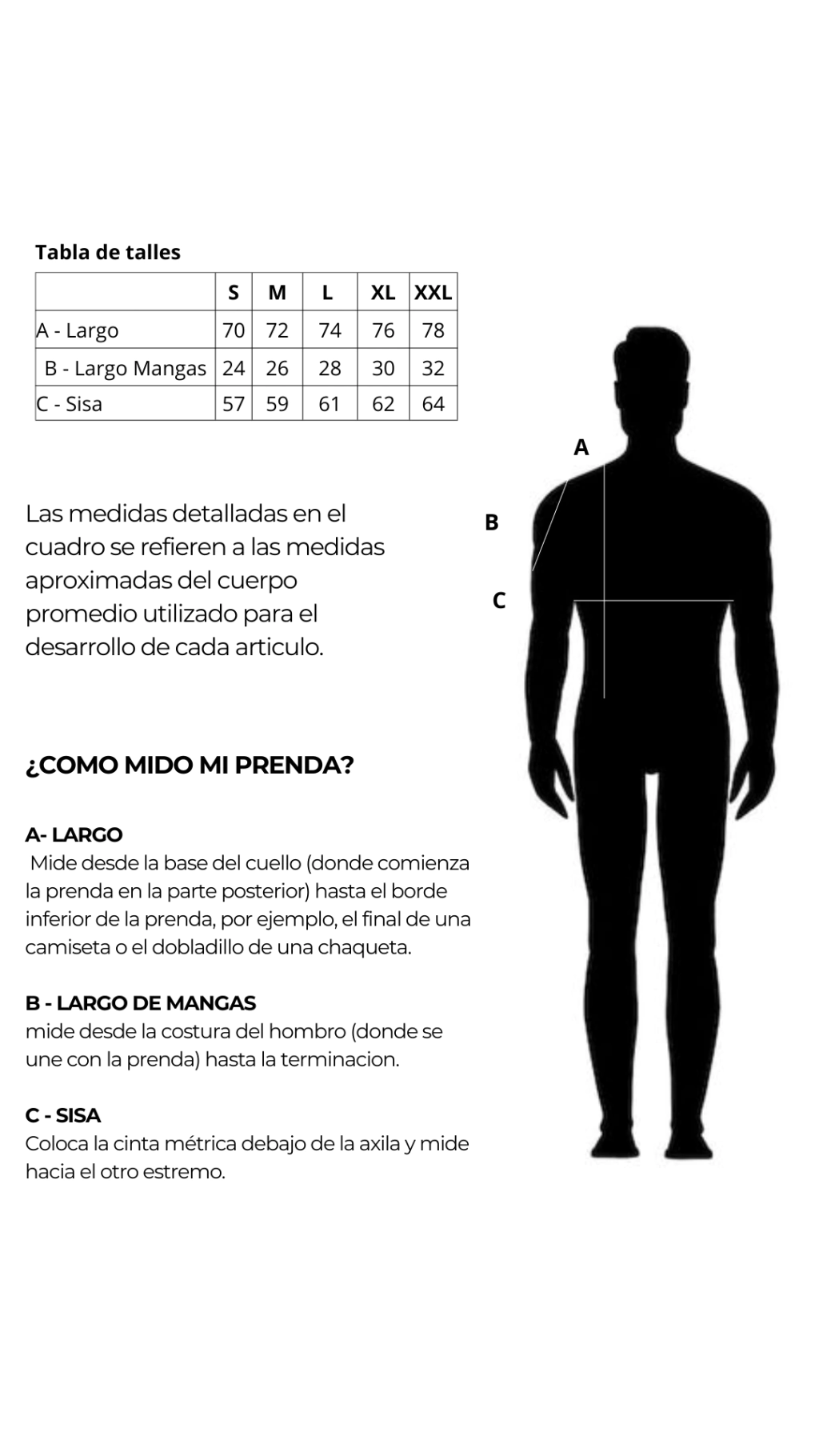 Las medidas detalladas en el cuadro se refieren a las medidas aproximadas del cuerpo promedio utilizado para el desarrollo de cada prenda.